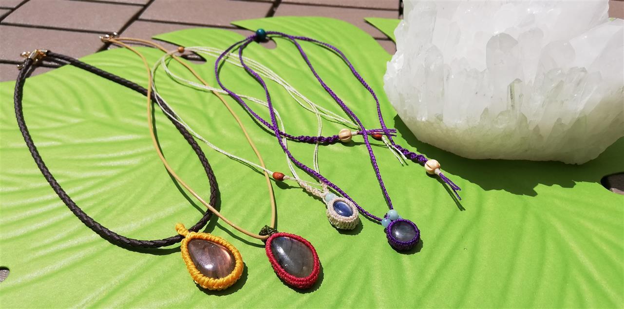 天然石を蝋引きの糸使用した《マクラメ編み》でアクセサリーにします。